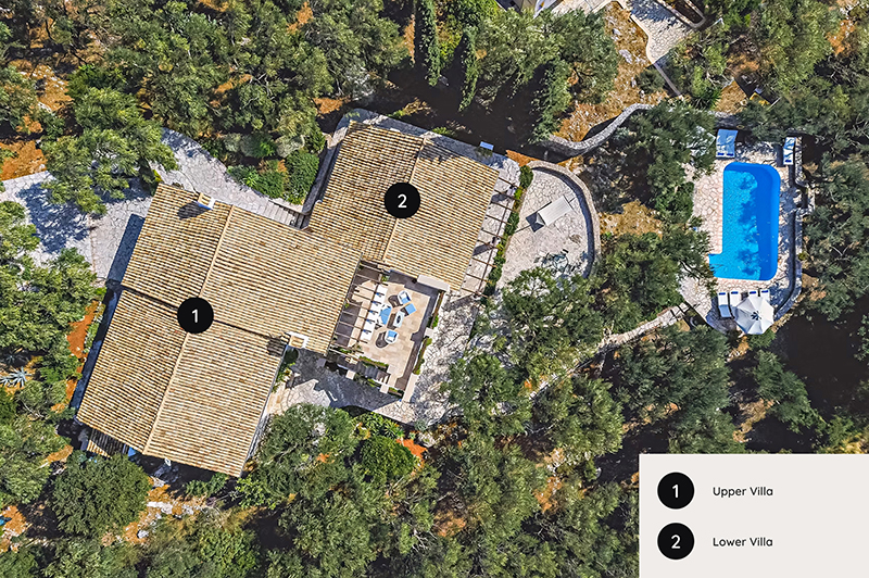 Spartilas Villas is perfect for its location, situated high on the hillside, but not too high into the mountains, the views are spectacular, from morning sunrise to evening sunsets, and admiring the expanse of the sea, the villages below to Corfu town and beyond in the distance. Also from the balcony you can see high into the mountains and the village of Spartilas above. The grounds are meticulously maintained year round, from the over 500 year old olive trees, to the lush gardens and fruit trees. All waiting to be explored wandering on the wide, illuminated paved walkways, from the parking area all the way down to the swimming pool and both villas in between. Spartilas Villas ticks all the boxes when looking for a holiday home that has everything. Inside the villa is just as special, with attention to detail at every corner, from the tastefully decorated rooms to the well equipped kitchens, to the most peaceful sleep in the luxurious beds. Come and stay and enjoy firsthand what all the past guests have written about. Spartilas Villas and the team are waiting for you.
